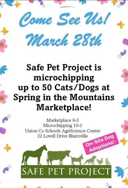 Safe Pet Project will be at the Spring in the Mountains Marketplace at the Union Co Schools AgriScience Center on March 28th with free microchips, information, and adoptable dogs! Please join us and if your pet needs a microchip, come find us!